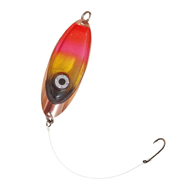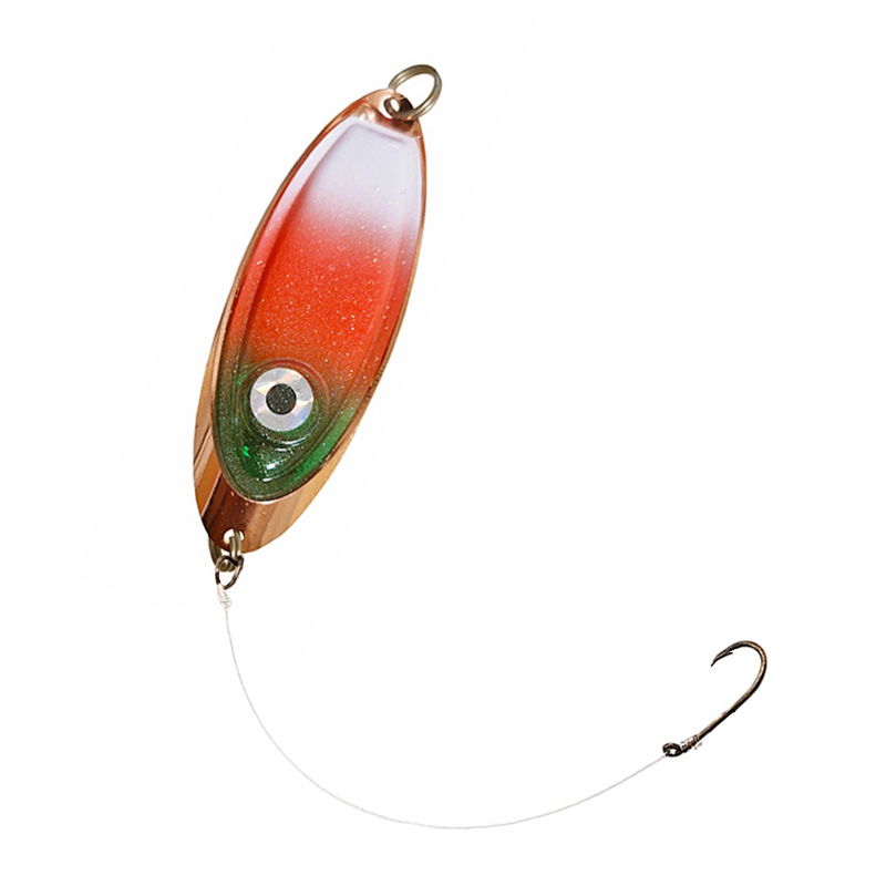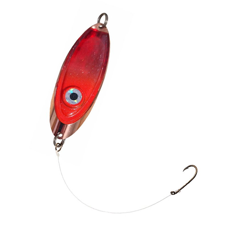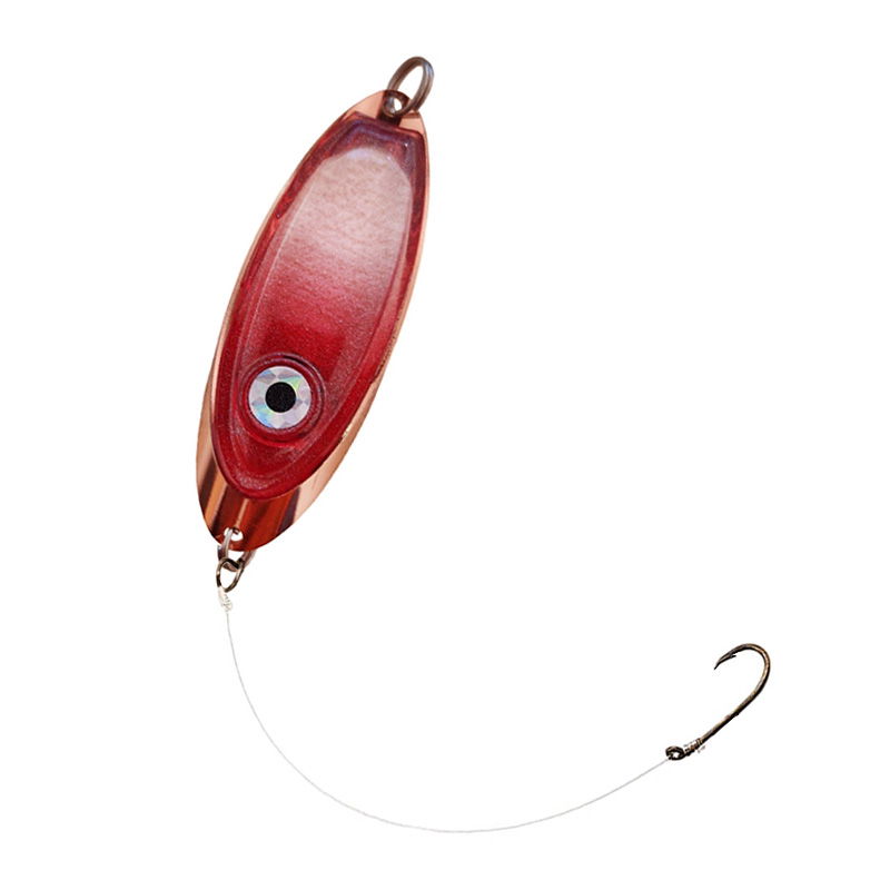 Modernt rödingblänke med inbyggd röd blinkdiod. Börjar blinka vid kontakt med vatten. Levereras med kroktafs med stark snapper.