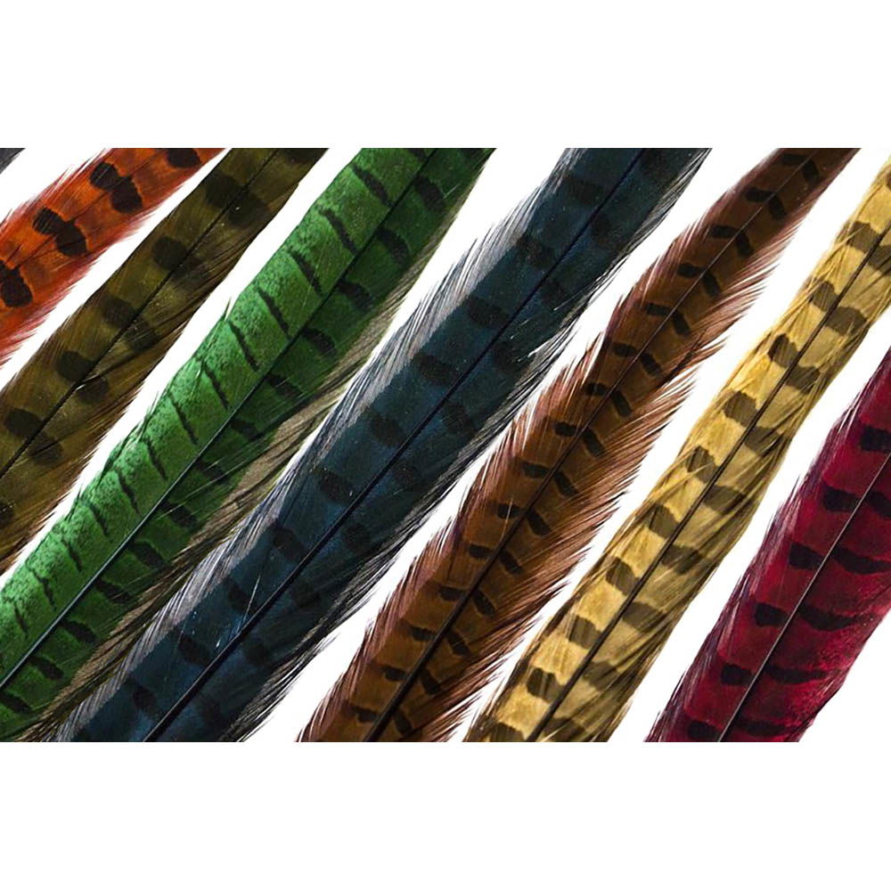 Stjärtfjäder av fasantupp i flera färger - ett klassiskt material till flugbindningen. Används i såväl nymfer som torrflugor man framförallt i den ikoniska "Pheasant Tail Nymph"
