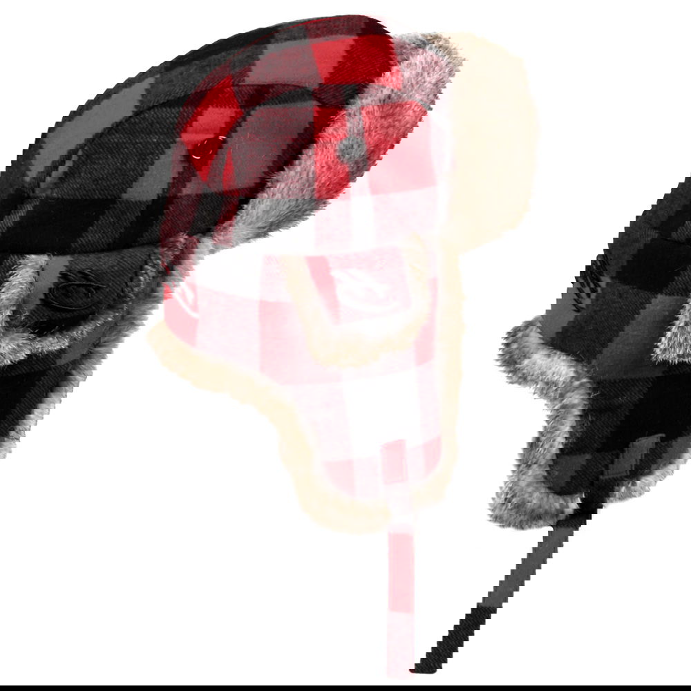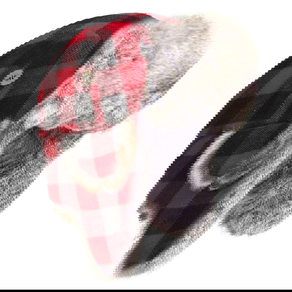 Varm och snygg pälsmössa i flanellyttertyg i röd/svart-rutig Loggerdesign.