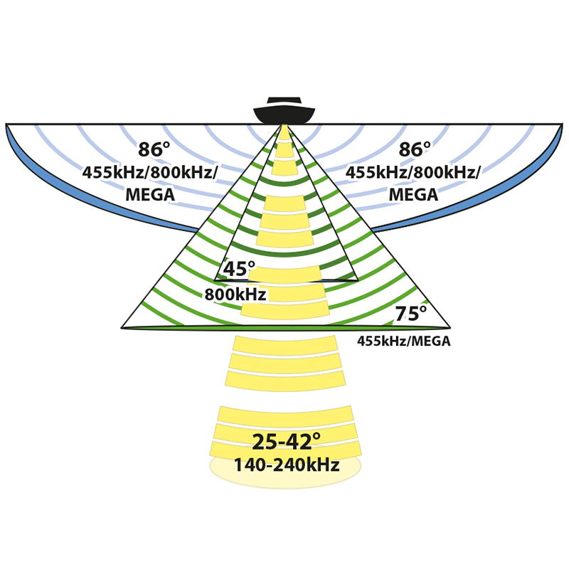 MEGA Imaging+ på XPLORE ger 150 meter räckvidd sida till sida och 75 meter på djupet samtidigt som det levererar kristallklara bilder med hög upplösning. För MEGA+ enheter erbjuder 455 kHz bandet en räckvidd på 244 m sida till sida och 122 m på djupet.