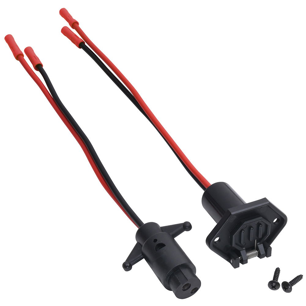 Snabbkontakt hona/hane för 12V där honan kan monteras infälld och skruvas fast. Fjäderbelastad lucka skyddar mot väta.
